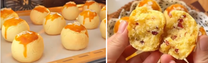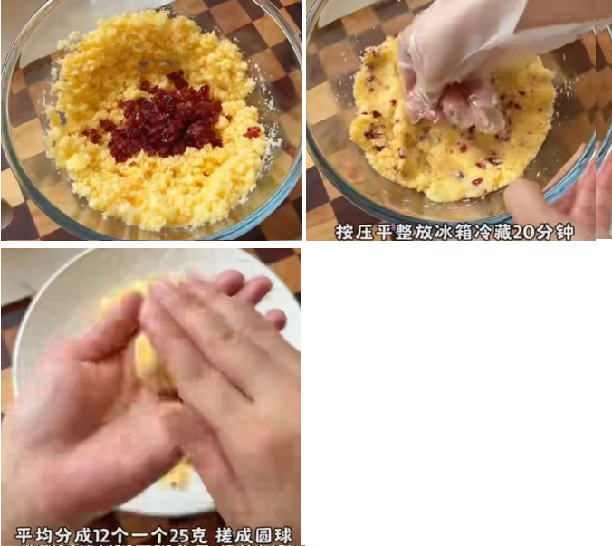 食材:90g椰蓉、35g白糖、40g奶粉、1个鸡蛋、65g软化好的黄油或椰子油、40g蔓越莓碎