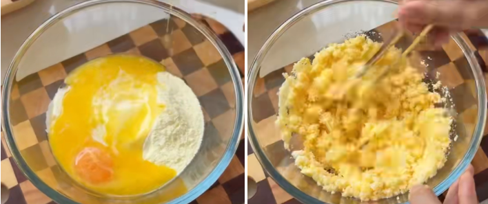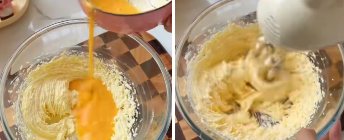 - 将余下的蛋汁再次加入拌匀;打不到的地方用刮刀整理到中间拌均;