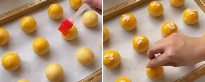 - 在顶部刷上蛋黄液,外加白芝麻或杏仁片作为装饰;